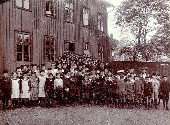 Elever samlade på gårdstomten, bakom gamla läroverket vid Storgatan.
