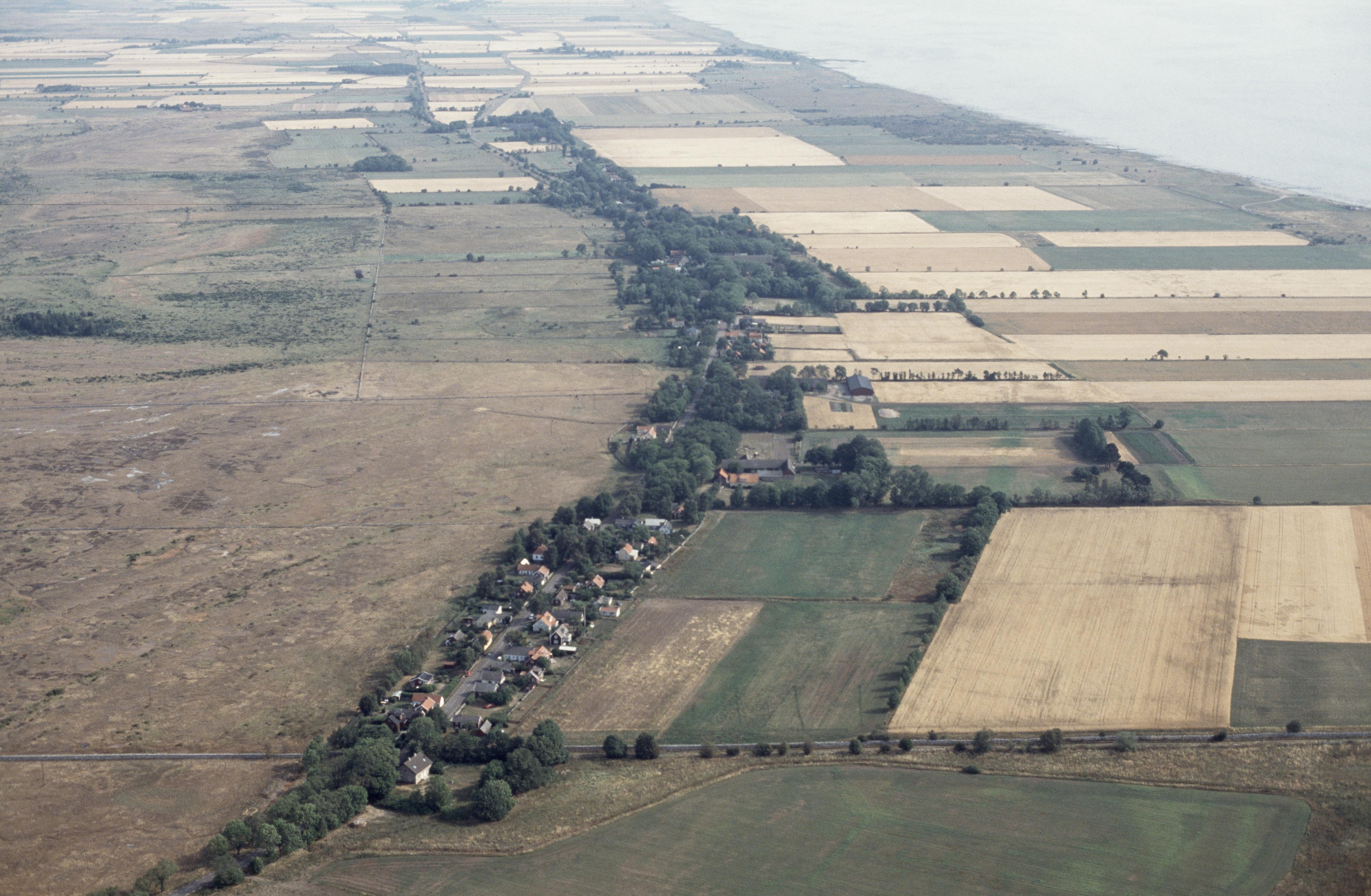 Alvaret. Mörbylångaleden norrut från Ås by. Karl X Gustavs mur RAÄnr Ås 36:1 i bildens nedre del. Näsby vid bildens mitt. I bildens övre del Enetri by. Bilden är tagen mot (väderstreck): NNO