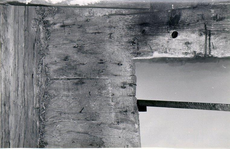 S:t Olofs kyrka. Västra väggen, där visartavlorna suttit. Hålet är för fästbulten.