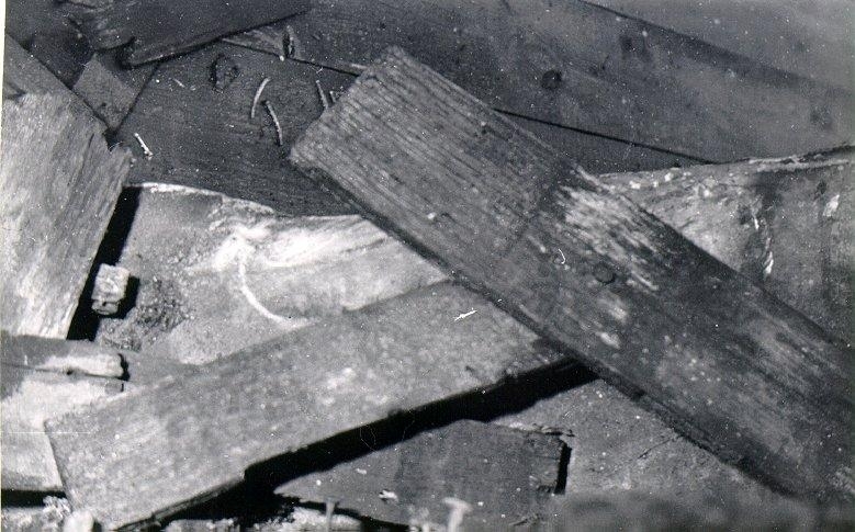 S:t Olofs kyrka. Yttersidans nedre del av tornurstavlans vägg. Rester av tidigare spånklädsel.