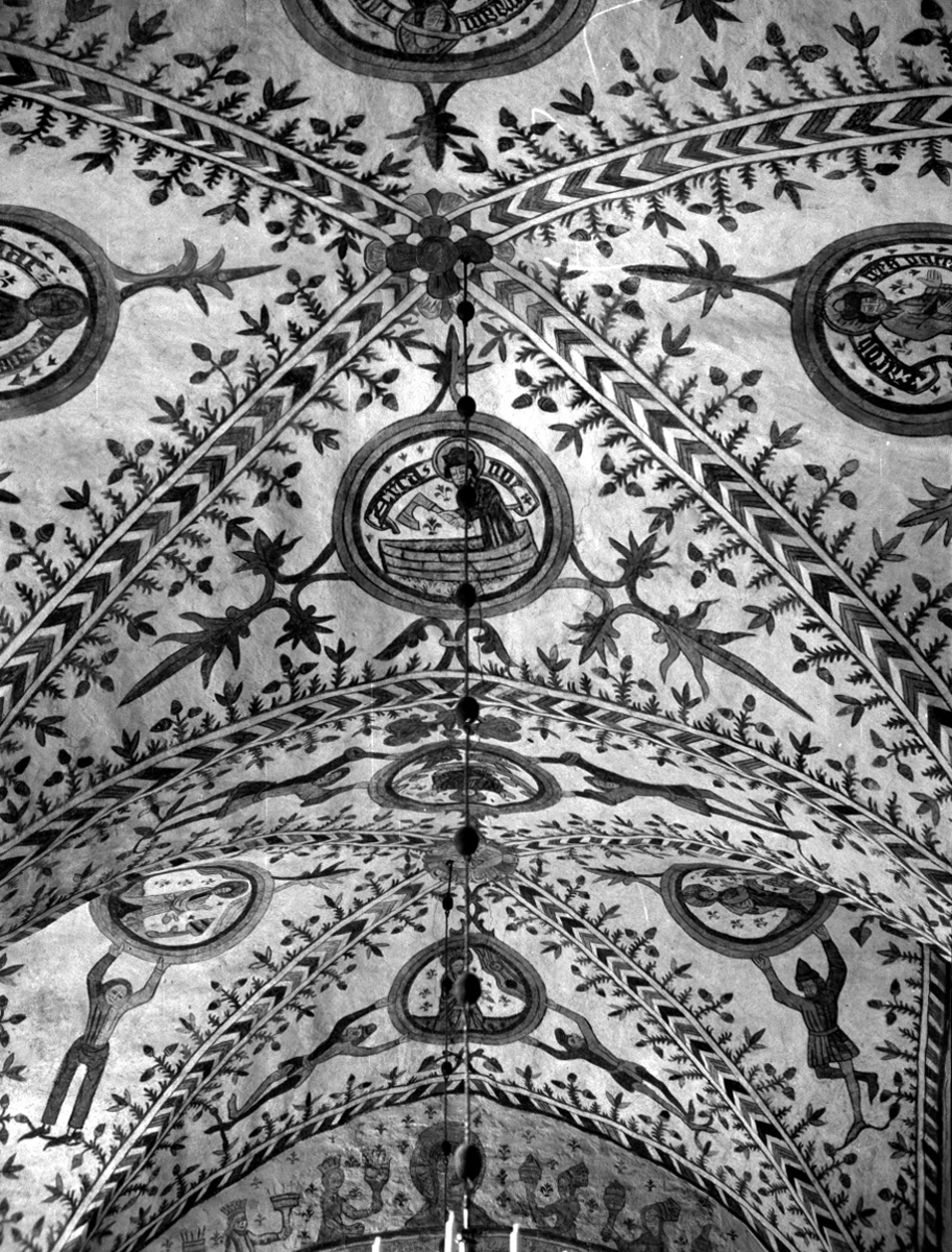 Gökhems kyrka. Medeltidsmålning i taket från 1400-talet. Valven utsmyckade med blommotiv och bibliska scener.