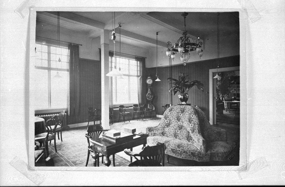 Rökrummet, där man bl.a. spelade schack. Tidningsrummet i bakgrunden.,