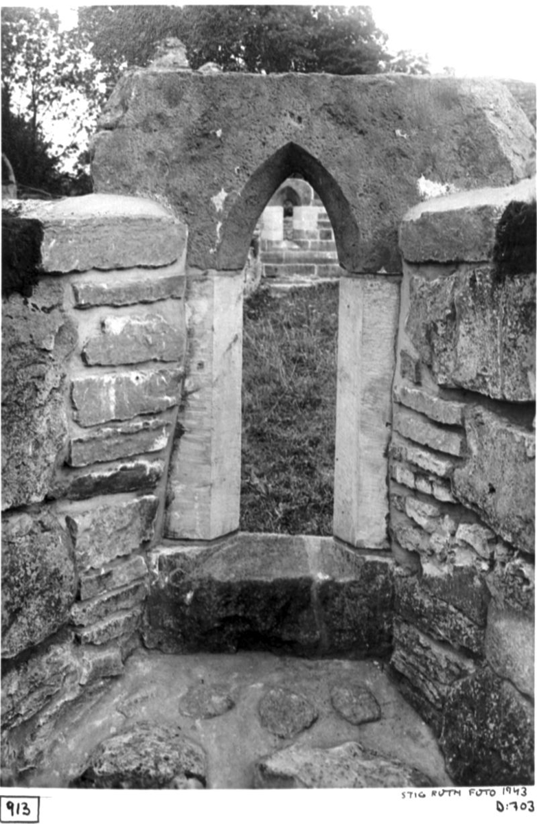 Norra korsgångens sydmur. Insidan. Östra fönstret återuppsatt, genom fönstret skymtar det återuppsatta fönstret i södra korsgången. Från norr.