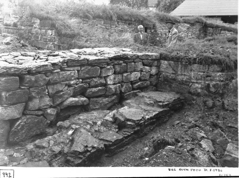 Anläggning i klostrets nordöst hörn. Mordmurens v. del mot sv., där bakom den nyuppförda kyrkogårdsmuren t.h. (borttagen).