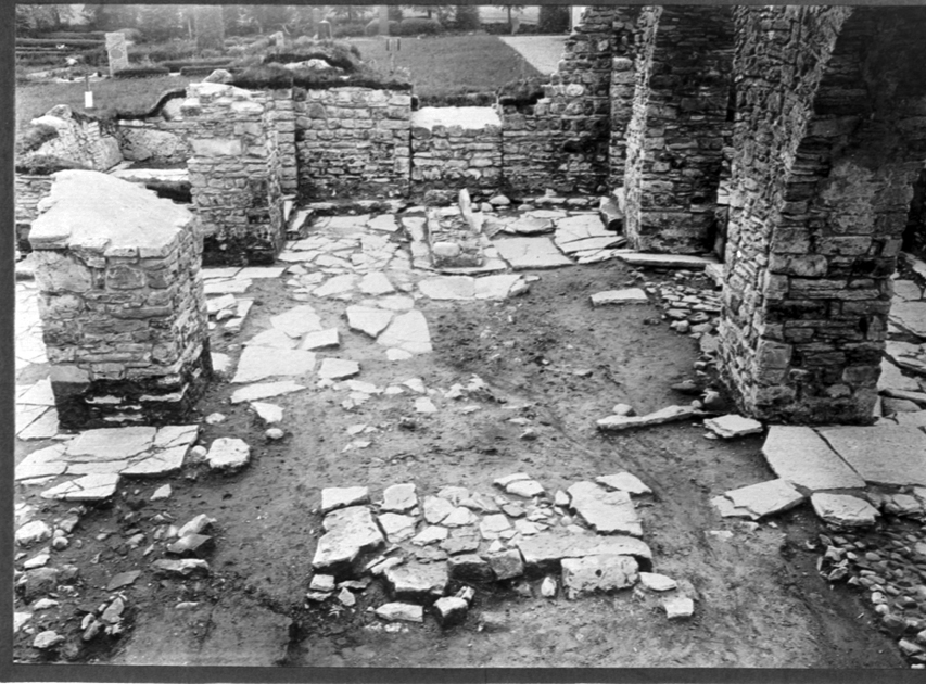 Kyrkan. Långhuset. Gamla golvet blottlagt. Roten av en rest sten (sandsten). Helga kors-altarets grund. Foto mot väst.