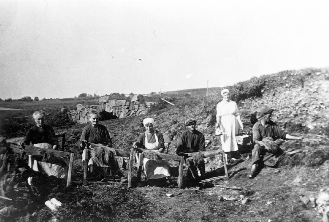Linbråtning vid gamla Saltkättlabrona. Byggdes 1850 revs 1926. Ester Andersson kommer med kaffet.