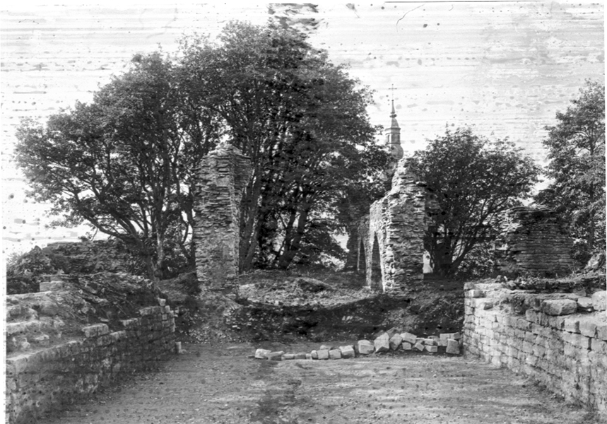 Kyrkan mittkoret foto mot väster. Nedrasad båge, gamla golvnivån ej nådd.