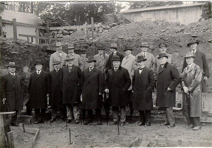 Storgatan 7-9, Ballerstenstomten. Sparbanksstyrelsen. Foto taget vid grundläggningen av Sparbanken. Övre raden fr. v.: ordföranden, chefred. Vrang, rådman Norder, tandläkare Rane, distr.-veterinär Kylén, sparbankskamrer Karl Edvard Lindström, direktör Haglund, arkitekt Ernst Thorulf, sparbanksvaktmästare Jonsson. Nedre raden fr. v.: grosshandlare Hagman, rådman Cedermark, rektor Wagnér, borgmästare Koch, järnhandlare Wiberg, trädgårdsmästare Lindblom, direktör Thorselius, handlanden Kilander, sparb.-kassör Hagman. Byggnadsfirman Knutsson och Berggren Jönk. utförde byggnadsarbetena.