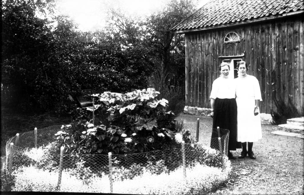 Ellen Kindblad och Elsa Andersson framför gamlastugan i Skymlagården.