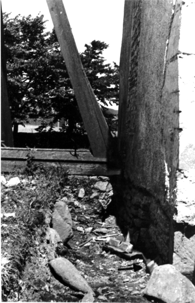 Östra Gerum. Västra gaveln snett från söder. Vid pilen finhuggen skråkant-sockel.