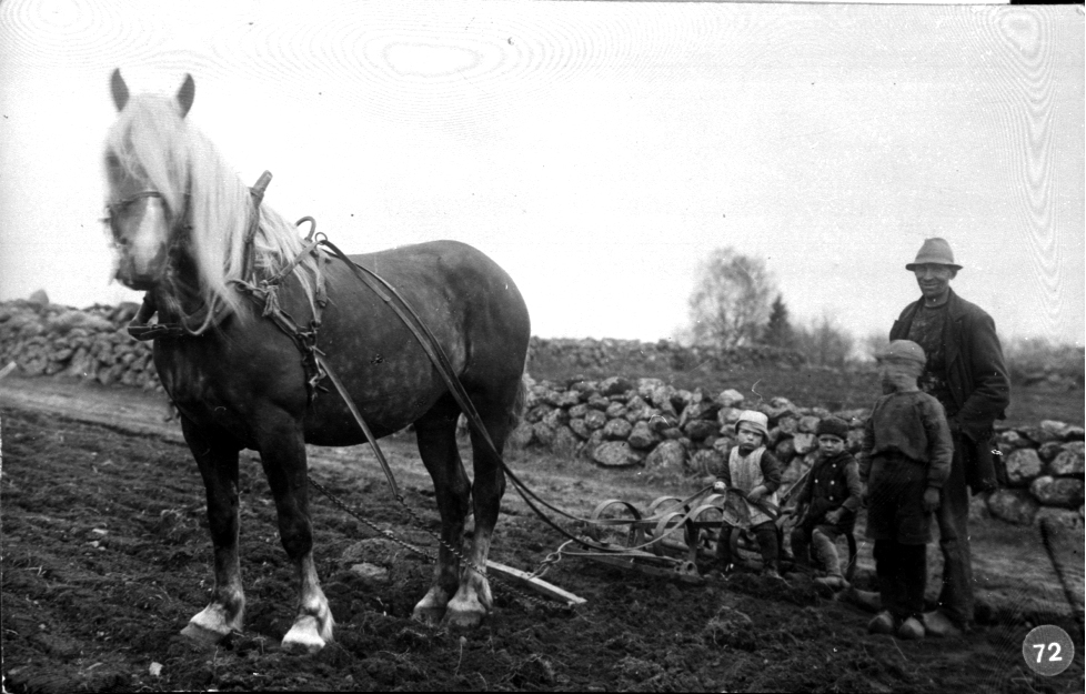 Karl Gustavsson med sönerna Gunnar, Allan och Bertil harvar med häst.