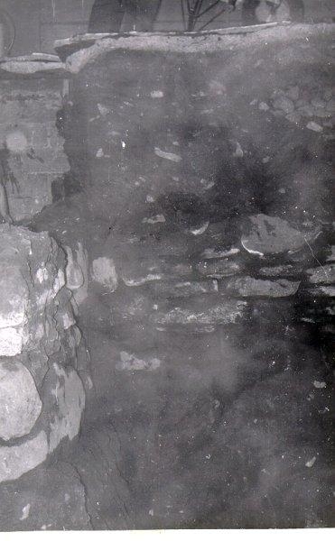 Kv. Rådmannen 2, Stora torget 19 - Storgatan 5. Grävningsarbete under Hägertz herrekipering. Till vänster "Korta murens" hörnstenar, längst in till vänster troligen murad mellanvägg. Djupet för murarsten markeras av arbetarens arm och betonggolvet , varpå en arbetares fötter synes .