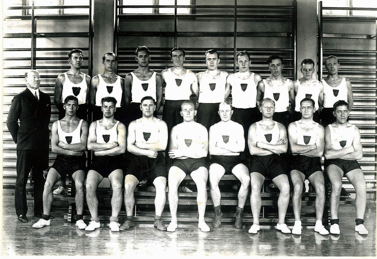 Gruppbild från Papyrus gymnastiksal. Gymnaster med ledare