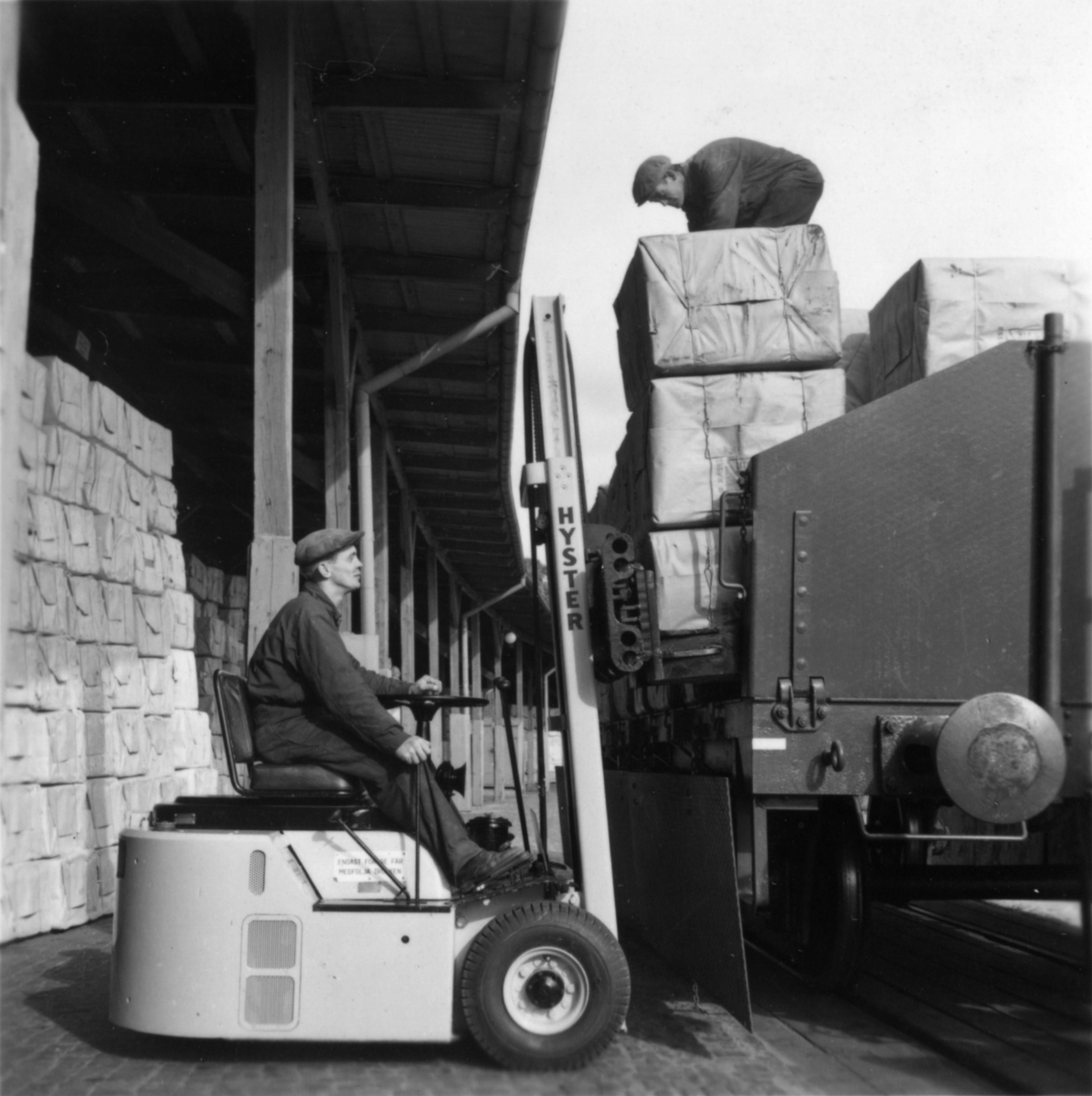 Lossning av massa med truck. Fr. v. Astor "Fisen" Johansson och Evert Samuelsson.