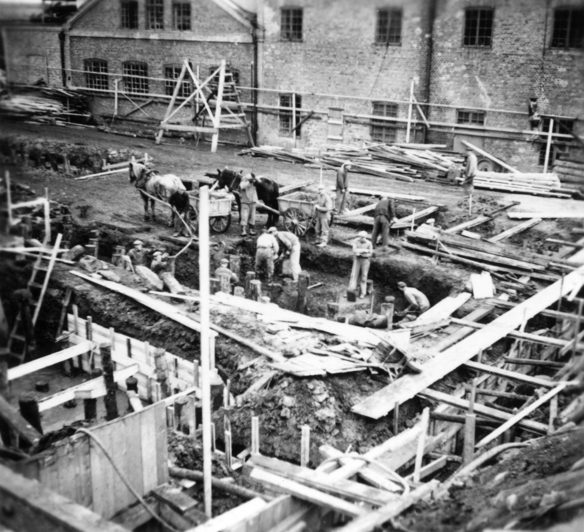 Lagerbyggnad 110 och 111 under uppbyggnad på Papyrus fabriksområde, 17/11-1945.