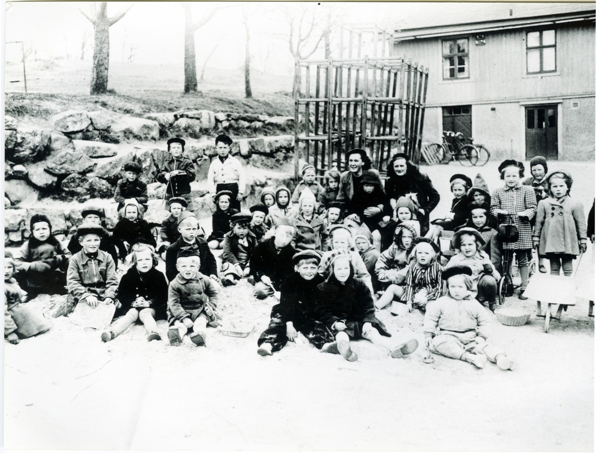 Bosgårdens barnträdgård på Lekskolegatan våren 1944. Barnen på bilden är mellan fyra och sex år gamla. De var där fyra timmar om dagen inklusive vilostunder. Under vilostunderna bjöds de på knäckebrödssmörgås med sirap. Bosgården drevs av stiftelsen ”Barnens Vänner”. Hunden hette Snuffsan.