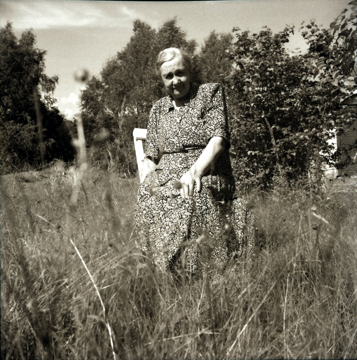 Persgårds-Anna i Hugalyckan sitter på en trädgårdsstol i högt gräs. Hon föddes 1895 i torpet Flyerna i Borshults by i Svartrå socken, men gifte sig med Teodor Johansson Persgård och de fick fem barn. I Hugalyckan bodde också systerdottern Anna-Lisa.