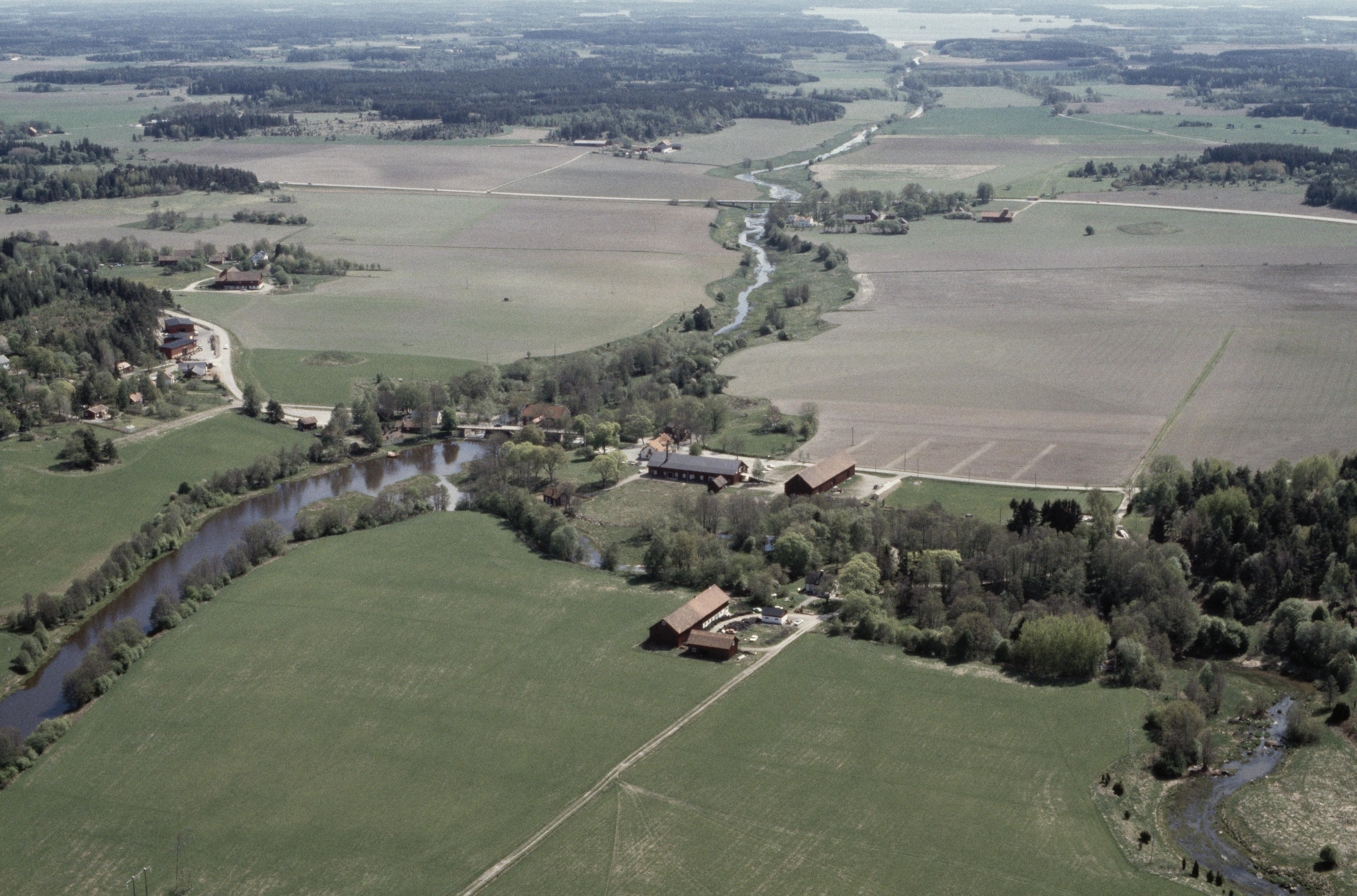 Uppe t.h. Kung Östens hög RAÄnr Björksta 106:1 i Östanbro. T.v. för Sagån Blotsvens hög RAÄnr Tillinge 33:1 i Tillinge sn, Uppland. Riksintresse C55 Östanbro, Up. Bilden är tagen mot (väderstreck): SO