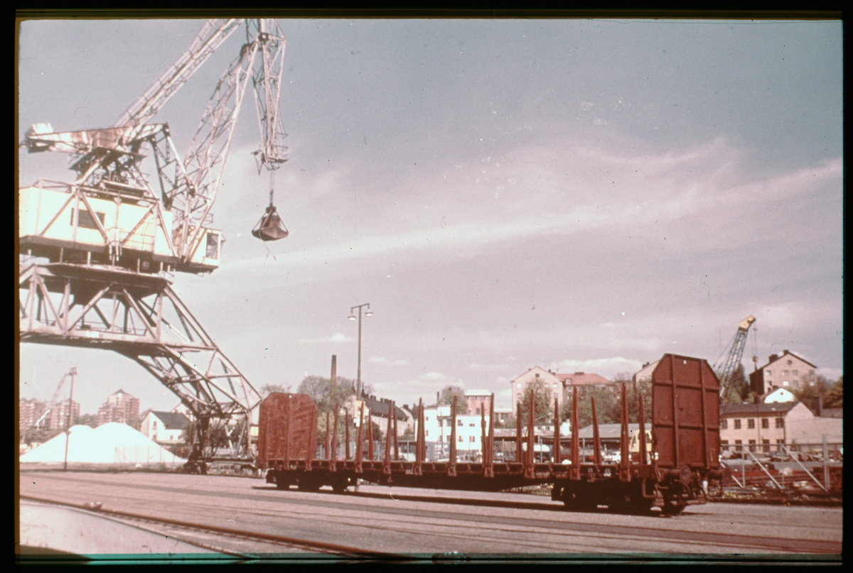 Öppen godsvagn på godsbangård.