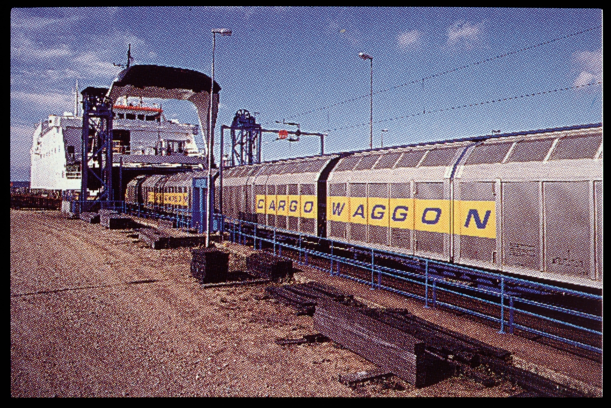 Godsvagnar märkta Cargowaggon vid tågfärja.