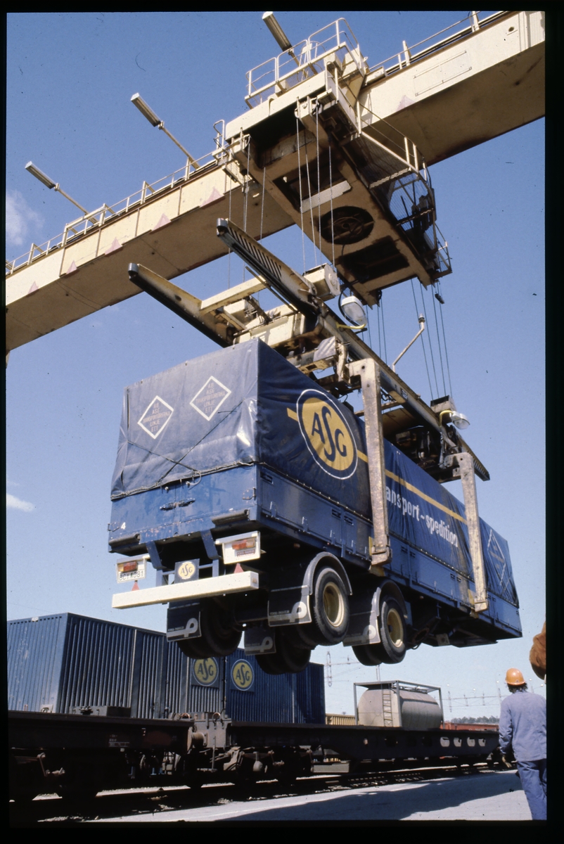 Släp lastas på godsvagn.
