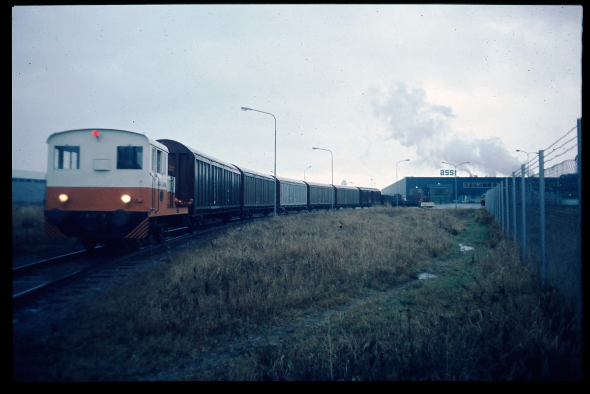Godstransport med lokomotor, vid Assi Domän fabriksområde.