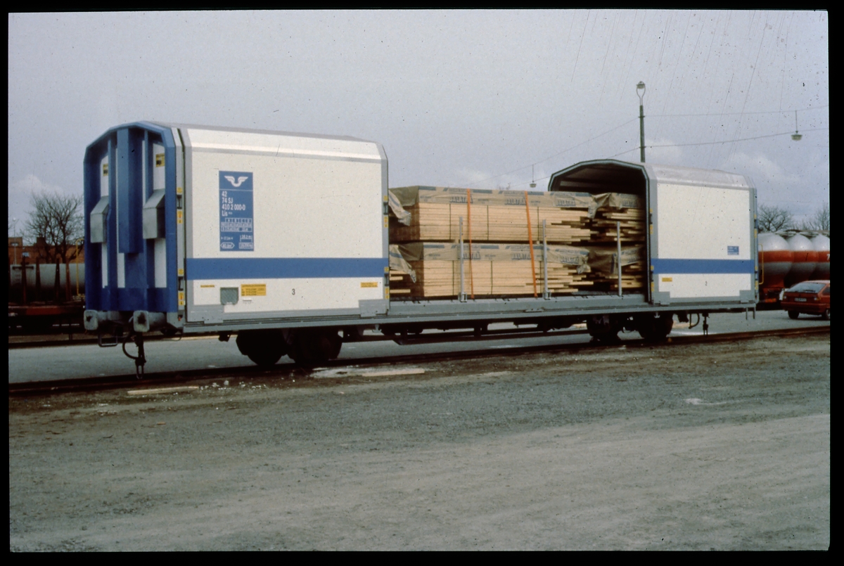 Statens Järnvägar, SJ Lis 42-74-410 2 000-0. Specialvagn lastad med bandade virkespaket.