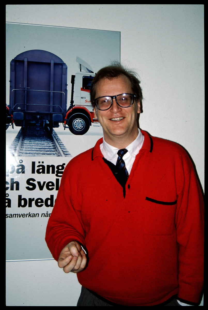 Man framför reklamaffisch för samarbetet mellan Statens Järnvägar och Svelast.