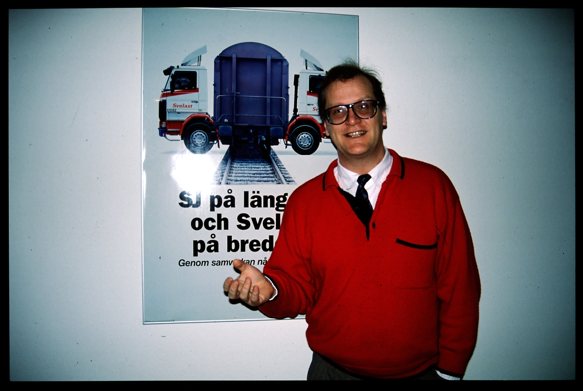 Man framför reklamaffisch för samarbetet mellan Statens Järnvägar och Svelast.