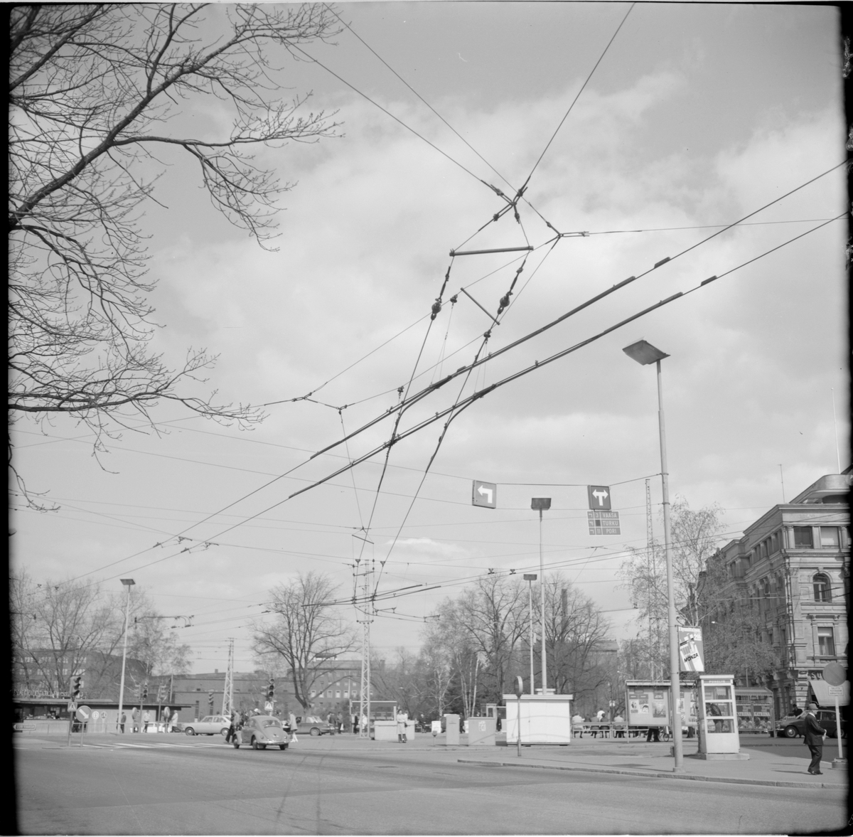 Del av Helsingin Kaupupungin Liikennelaitos, HKL kontaktledning vid Senattorget i Helsingfors.