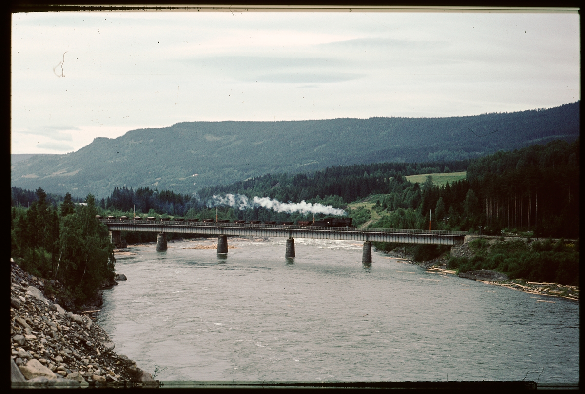 Norges Statsbaner, NSB. Gruståg på bron över Lågen vid Hunderfossen. Kilometer 197,28 på Dovrebanen.