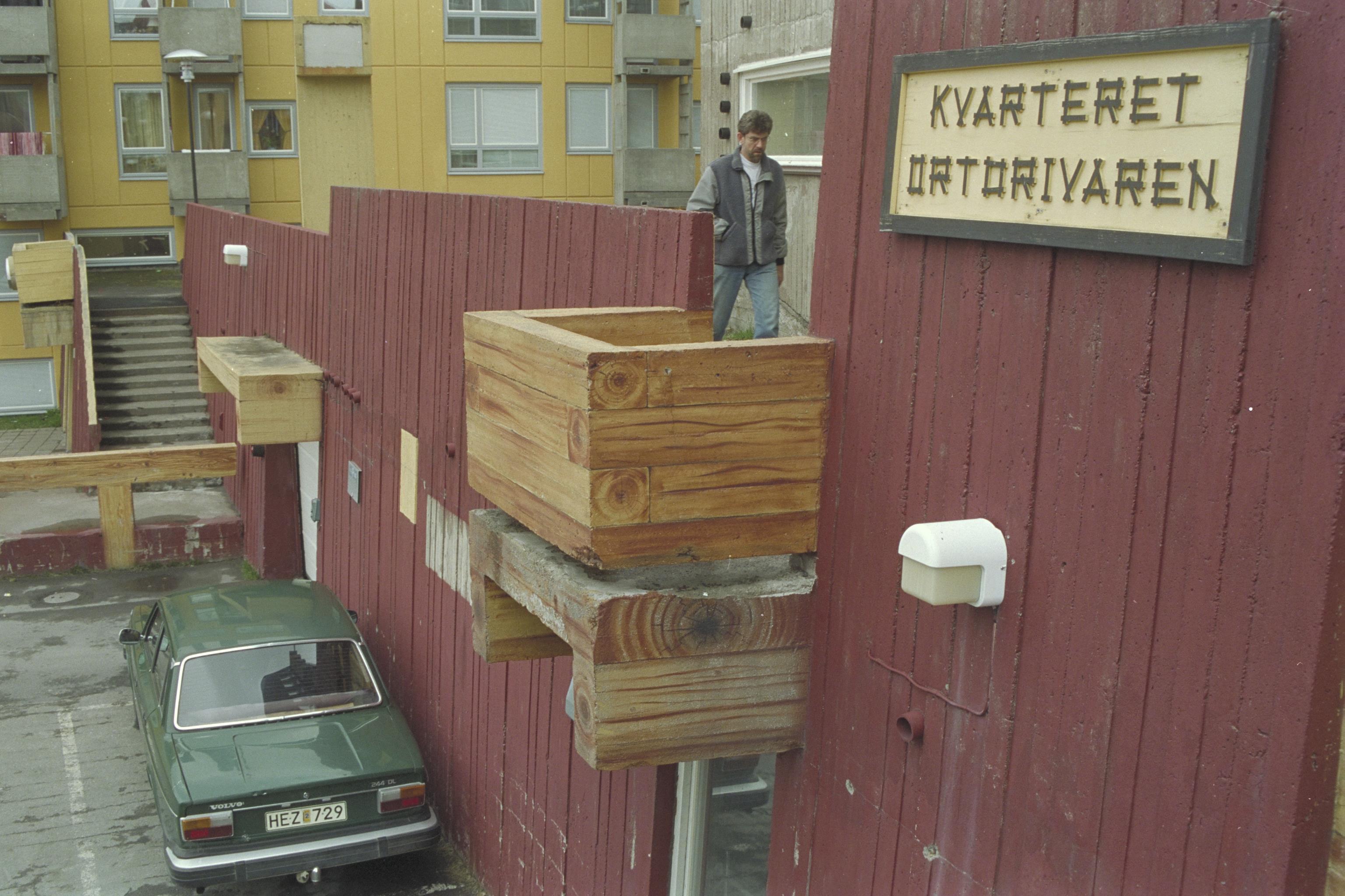 Kv. Ortdrivaren, målade betonghus med trästruktur.