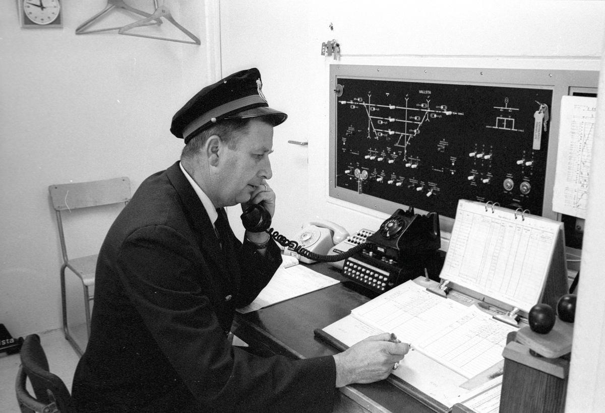 Tågklarerare vid ställverk. Vallsta gamla stationshus