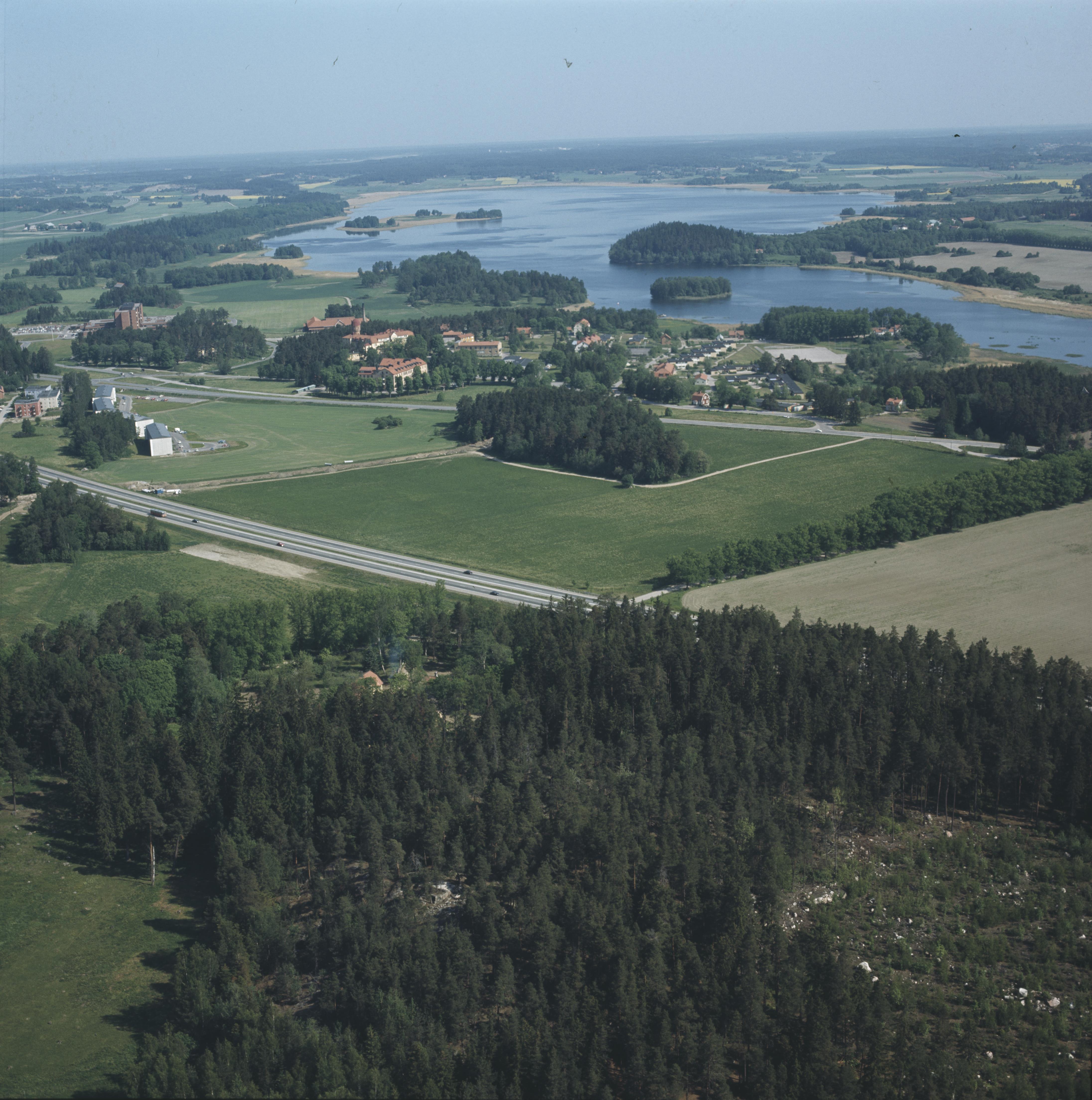 E4 och sjön Fysingen från sydväst. Löwenströmska sjukhuset / Löwenströmska lasarettet uppe till vänster i bild.