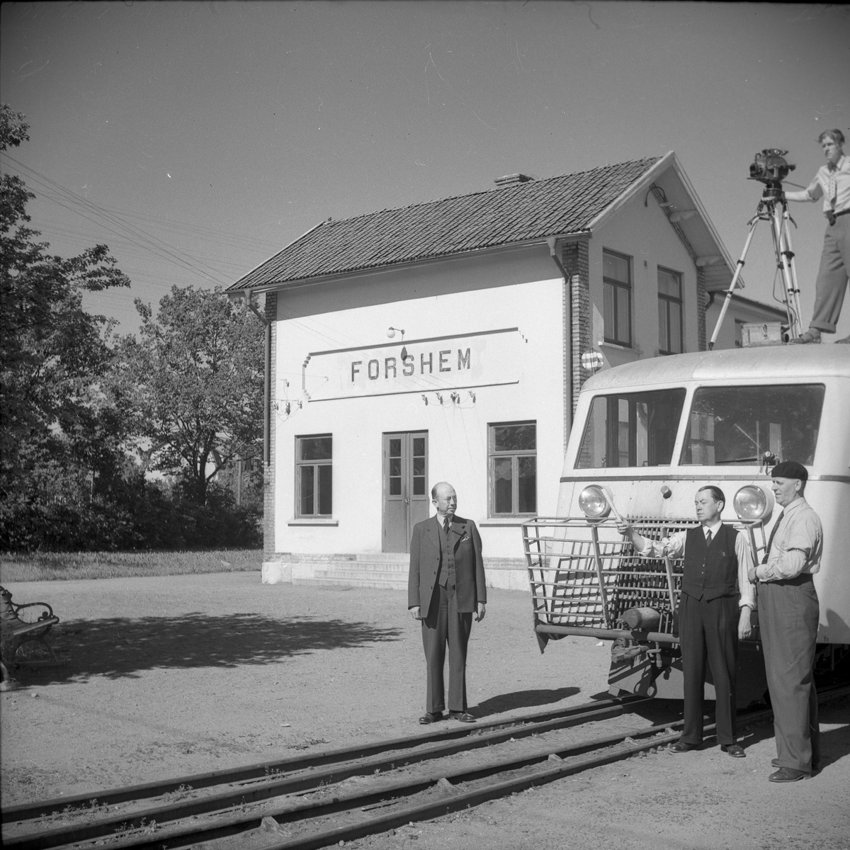 Filminspelning av SJ vid Forshem järnvägsstation i samband med förstatligandet av linjen. På spåret syns en motorvagn från Hilding Carlsson.