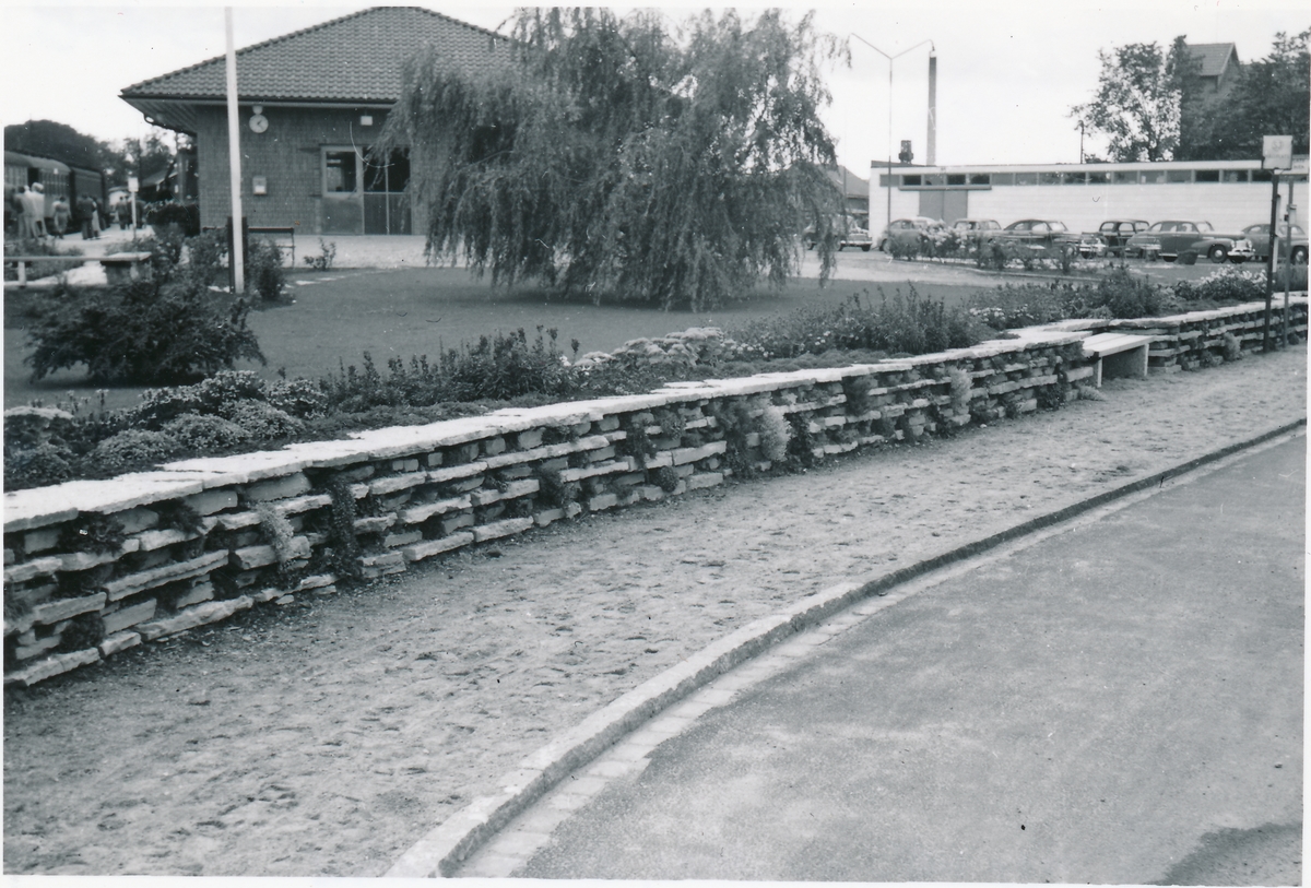Titel: Trädgårdsanläggning vid stationen. Stationen öppnad 1901 med ett stationshus i trä, som ansågs vara ett provisorium tills banan dragits in till Kristianstad C. Nytt stationshus byggdes dock först 1954-55, varefter det gamla revs.