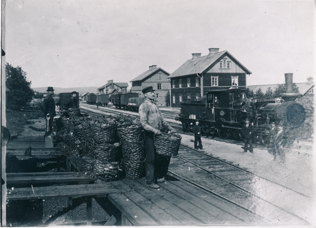 Personal fyller kolkorgar vid kolbryggan. På spåret står lok Bb 28