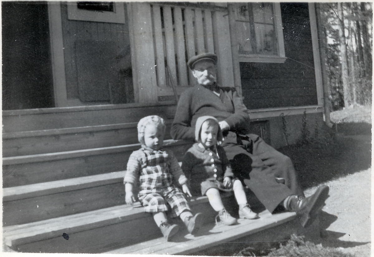 Sista våren/sommaren i Långsjön. På långsjötrappen sitter gammelfarfar Per Andersson med barnbarnsbarnen Lillemor och Astrid.