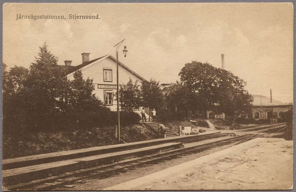 Stationsområde med vy på perrong och lokstall i backgrunden.