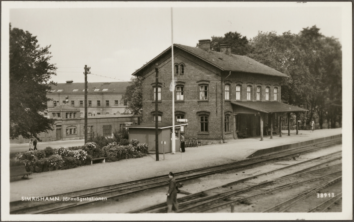Stationsområde med vy på kiosk och stationshus med bebyggelse i bakgrunden.