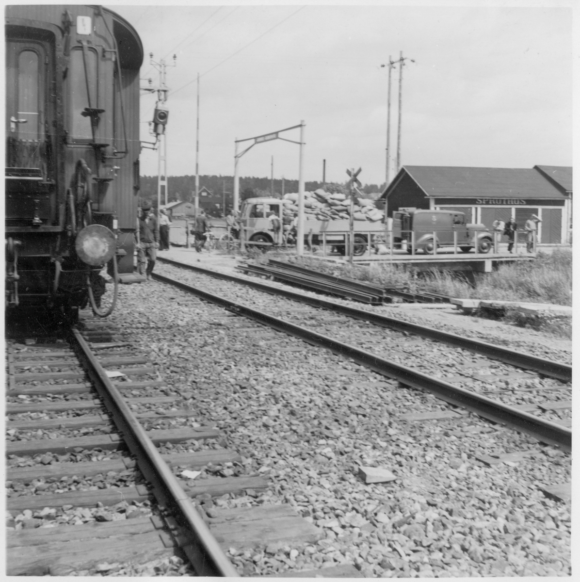 Vy på vagn och motorfordon vid järnvägsövergång.