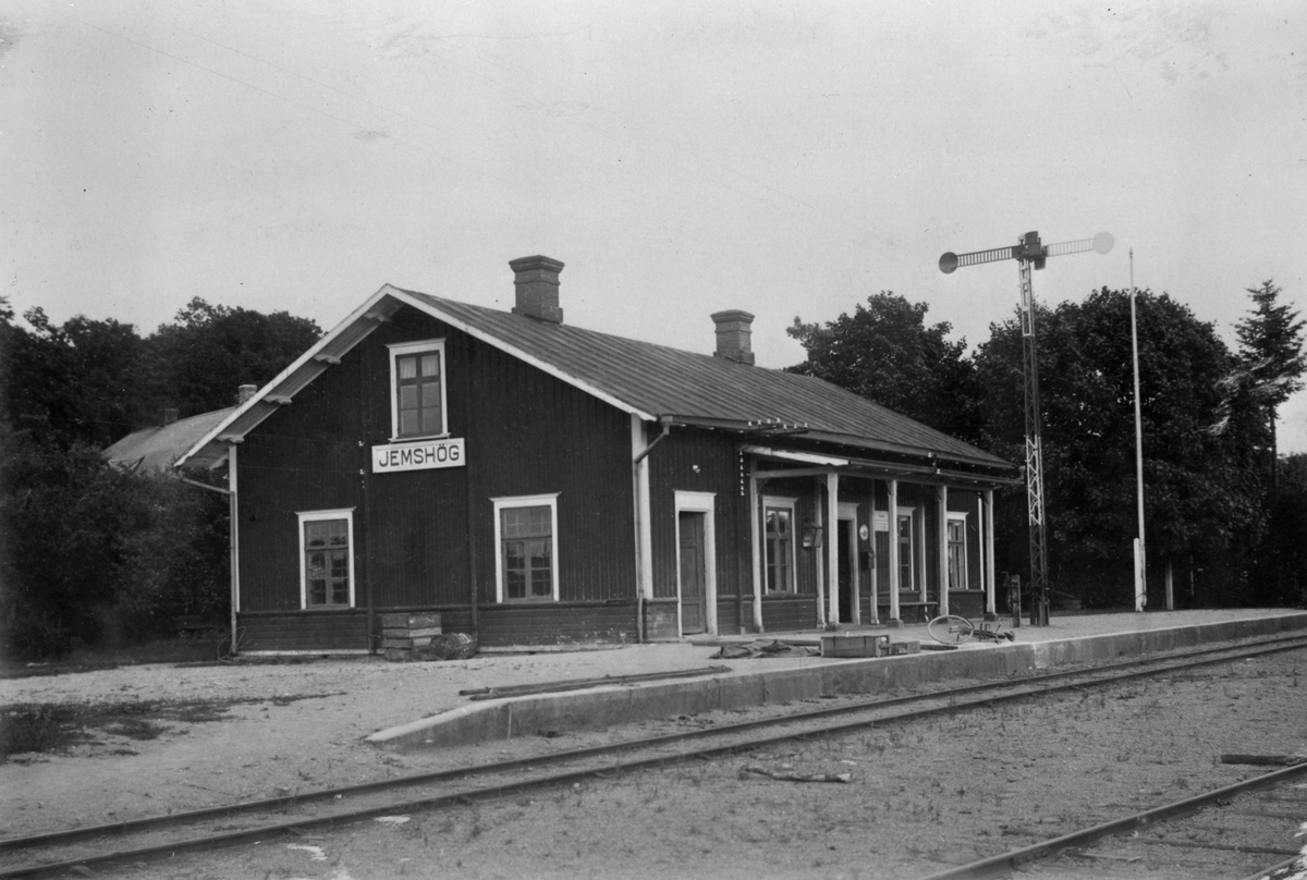 Jämshög station. Hållplats anlagd 1886. Station utmed den så kallade Holjebanan, från Holje till Sandbäck. Semaforen på plattformen har så kallade gallerverksvingar.