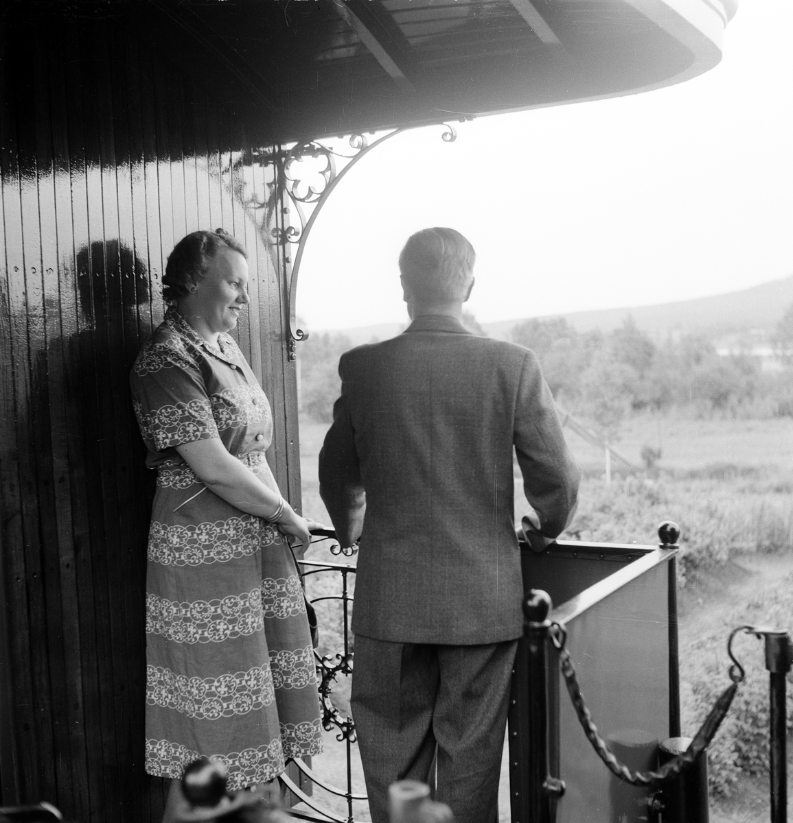 Statens Järnvägar, SJ sommartåghem Stockholm - Göteborg. Resenärer samtalar på vagnsplattform