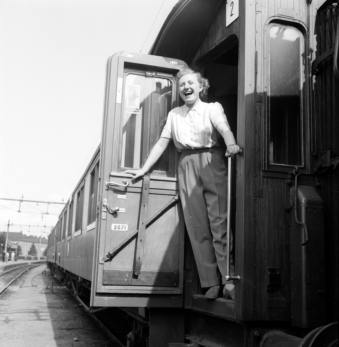Statens Järnvägar, SJ tåghem under uppehåll på okänd plats. Kvinna vid öppen dörr på sovvagn. Vagn SJ A04 2071.