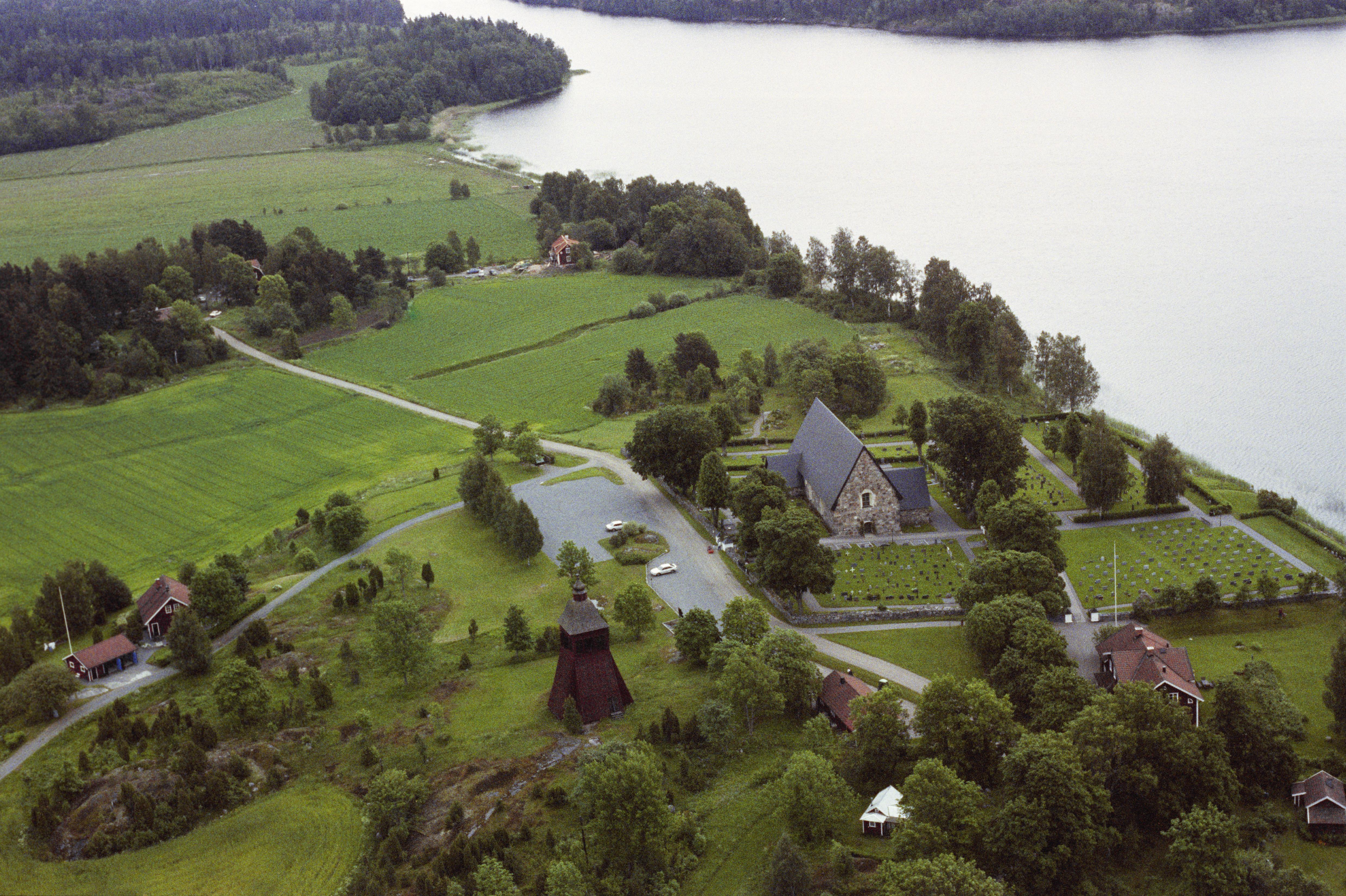 Länna kyrka i bildens mitt, Länna kyrksjö till höger. Fotot från nordväst.