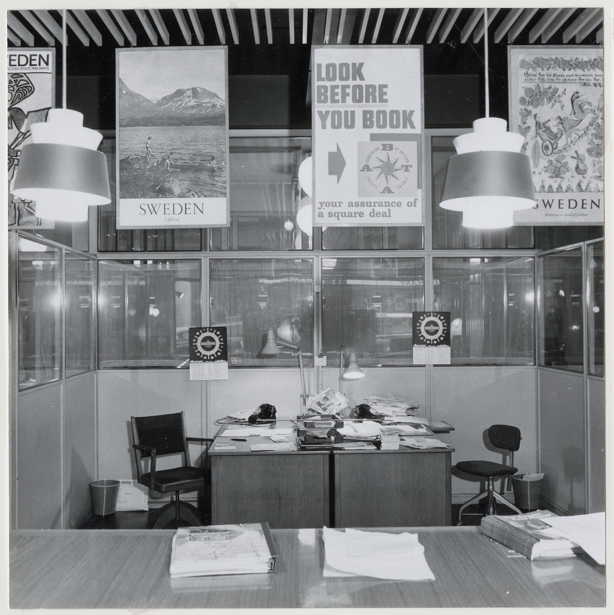 Titel: Statens Järnvägar, SJ Resebyrå i London under namnet 'Swedish Travel Bureau'. Vid den här tidpunkten låg resebyrån 7-8 Conduit Street i London.