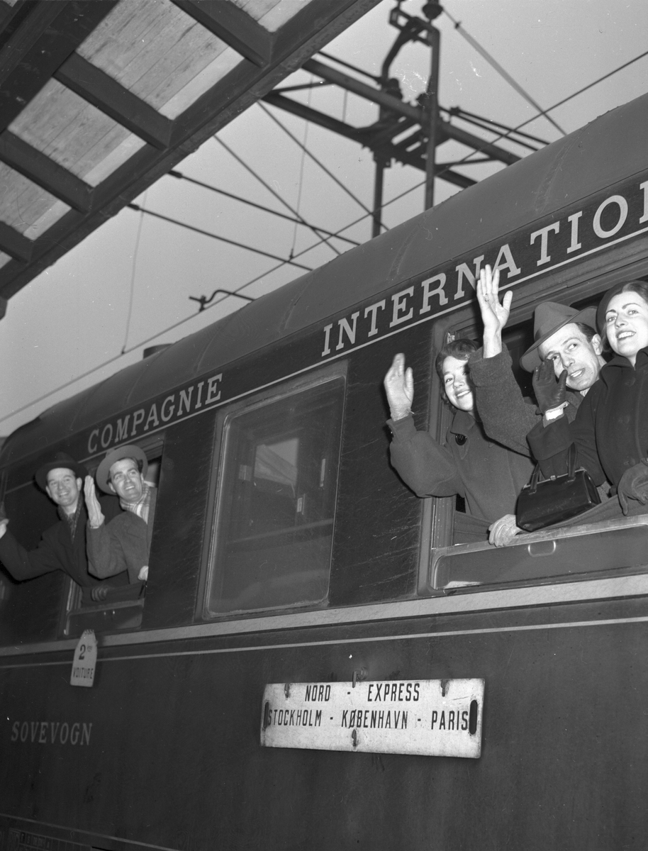 Resande på Nordexpressen vid avgången från Centralstationen i Stockholm. Statister från Reka.