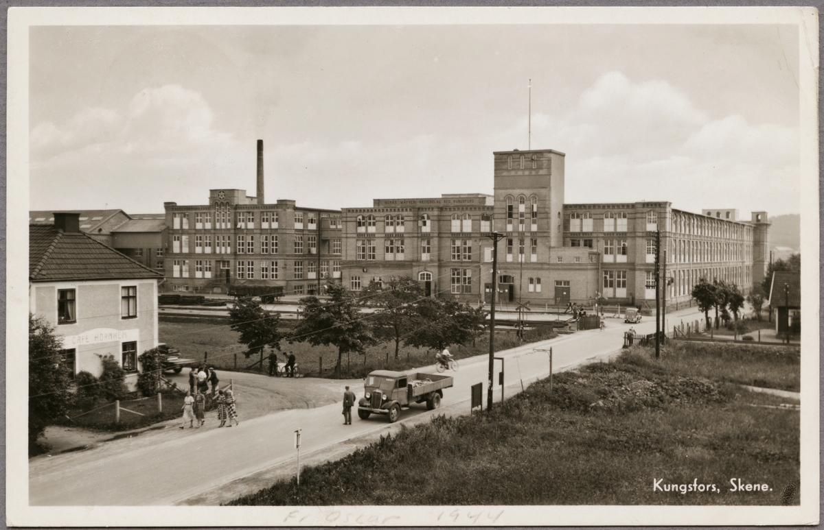 Vy över Borås Väveri Ab, fabriken i Kungsfors. Till väntser skymtas Café Hörnhem.