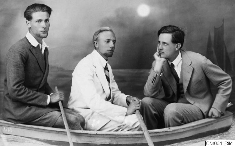 Posering i båt. Alfred Westholm, John Lindros och Einar Gjerstad.