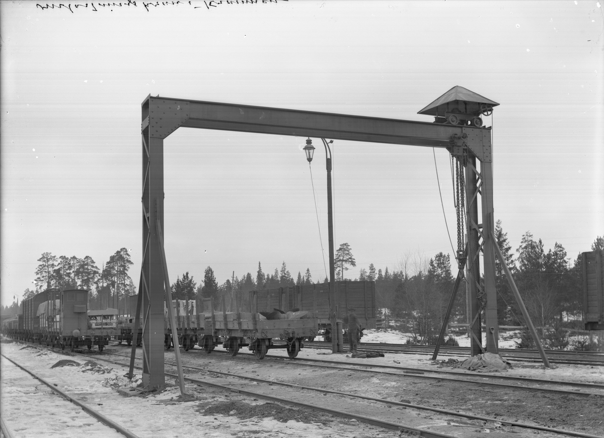 Omlastningskran i Krampen. Omlastning av gods mellan smalspåriga vagnar från Köping - Uttersberg - Riddarhyttans Järnväg, KURJ och normalspåriga vagnar från Statens Järnvägar, SJ.
